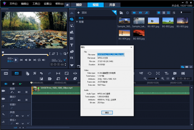5、如下图所示,会声会影弹出窗口显示,该素材的分辨率为1920×1080、帧率为29.97帧/秒、码率为5427kbps。